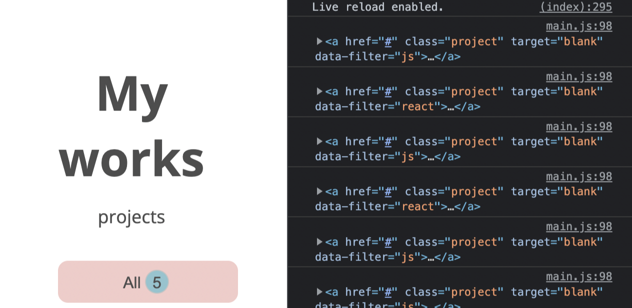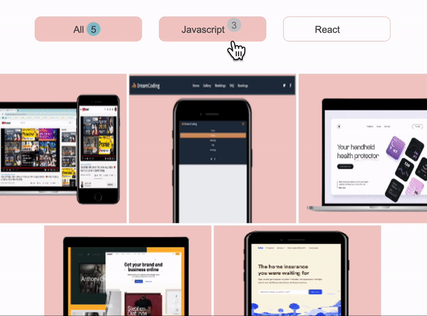 <div class="section__container"> <div class="work__categories"> <button class="category__btn active" data-filter="*">All<span class="category__count active">5</span></button> <button class="category__btn" data-filter="js">Javascript<span class="category__count">3</span></button> <button class="category__btn" data-filter="react">React<span class="category__count">2</span></button> </div> <div class="work__projects"> <!-- href: git url --> <a href="#" class="project" target="blank" data-filter="js"> ... </section>๋ฒํผ์ ํด๋นํ๋ work__catergories์ ๊ฐ ๋ฒํผ ํด๋์ค์ data-filter๋ฅผ ์ถ๊ฐํ๋ค.