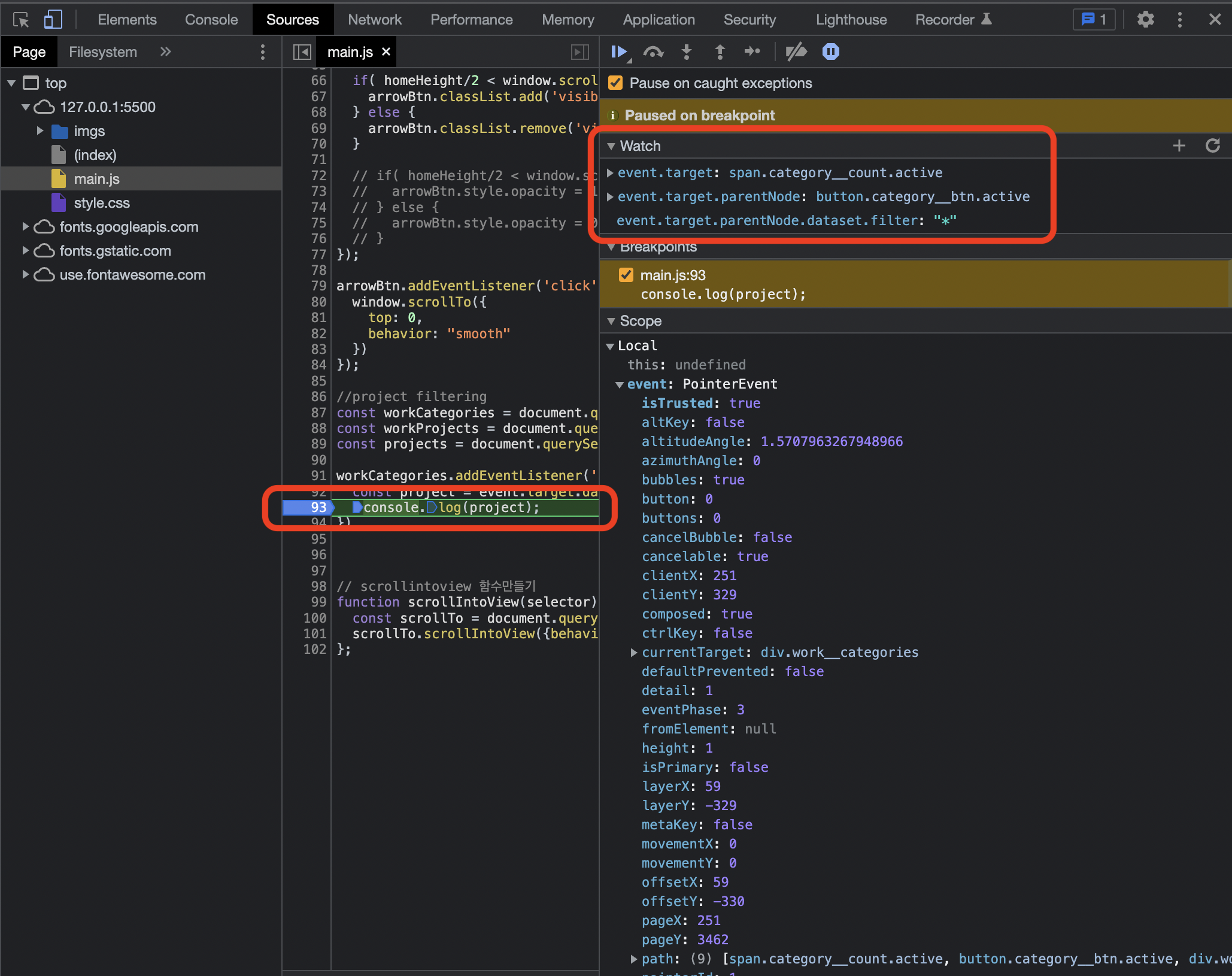 ํฌ๋กฌ ๊ฐ๋ฐ์ ๋ชจ๋์์ ํ์ธํด๋ณด์ ์ด๋ฐ ๊ฒฝ์ฐ์๋ ํฌ๋กฌ ๊ฐ๋ฐ์๋ชจ๋์ ๋ค์ด๊ฐ์ undefined๊ฐ ๋ฐ์ํ๋ ๋ถ๋ถ์ breakpoint๋ฅผ ๊ฑธ์ด๋๊ณ local ๋ฑ์์ ์ด๋ค ํญ๋ชฉ๋ค์ด ์ ์ฉ๋์ด ์๋์ง ํ์ธํด๋ณธ๋ค. ์ฌ๊ธฐ์๋ ํ์ฌ event.target์ด ๋ฐ์ํ ๋ฒํผ(category__count.active)์ ๋ถ๋ชจ๋ ธ๋(button.category__btn.active)์ ์์์ filter๋ฅผ ์ค์ ํด๋์๋ ํด๋์ค๊ฐ ๋ค์ด์๊ธฐ ๋๋ฌธ์ ํด๋น ๋ฒํผ์ ๋๋ ์ ๋์๋ ๋ถ๋ชจ๋ ธ๋๋ก ์ฌ๋ผ๊ฐ์ data๋ฅผ ๊ฐ์ ธ์ค๋๋ก ์ค์ ํ๋ฉด ๋ ๊ฒ ๊ฐ๋ค.